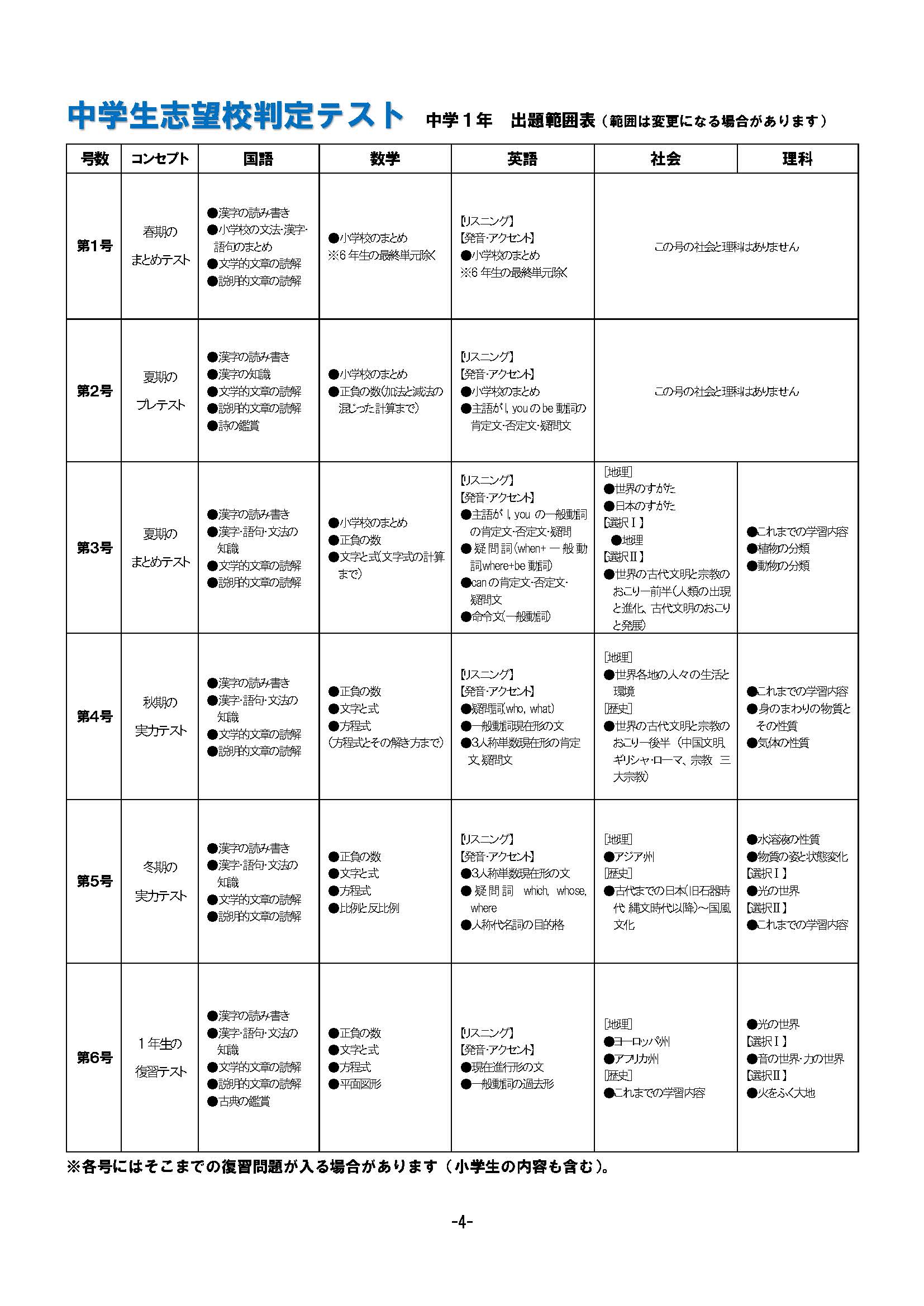 中学生1年 志望校判定テスト 出題予定表