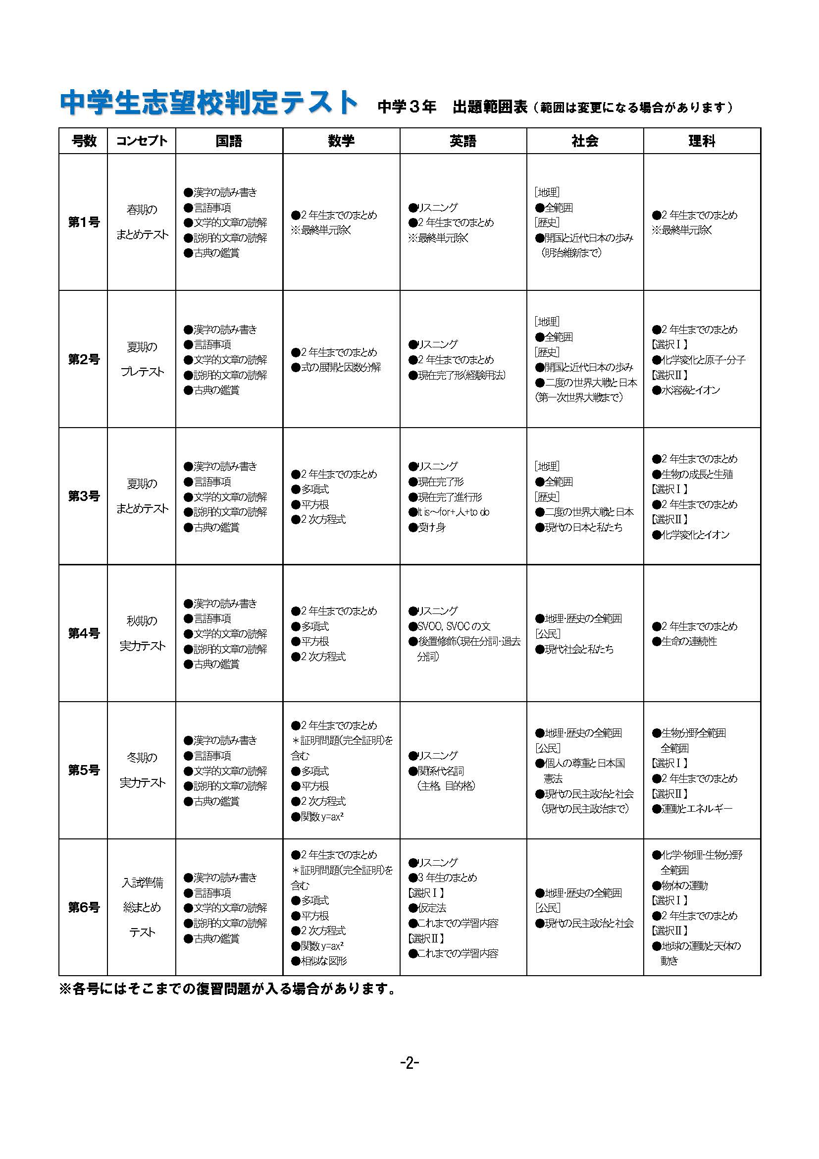 中学生3年 志望校判定テスト 出題予定表